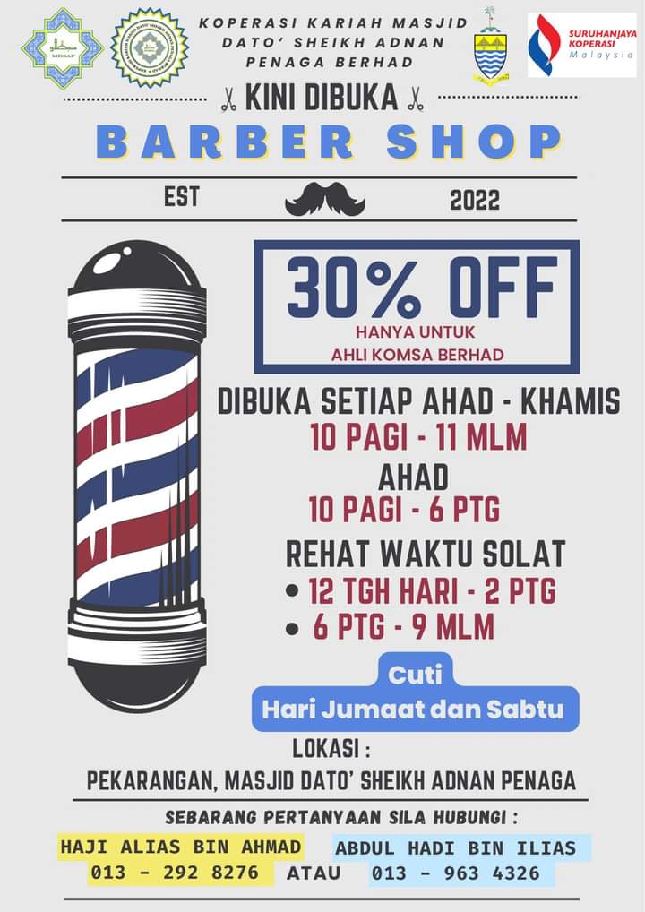 Menyediakan perkhidmatan gunting rambut setiap hari kecuali hari Hari Jumaat dan Sabtu.kita ada pakar gunting rambut untuk fesyen terkini dan yang best bilik berhawa dingin.